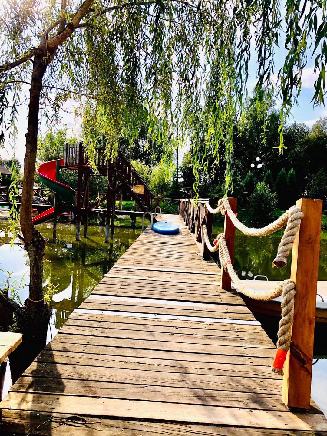 -staw kąpielowy o pow20ar z trzema pomostami zjeżdżalnią oraz plażą,